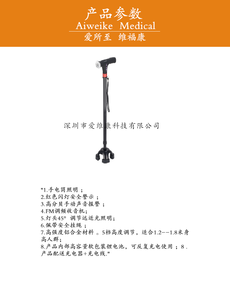 "愛維康紅色閃燈安全警示 3高分貝手動聲音報警智能拐仗"